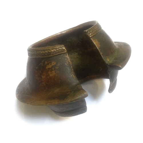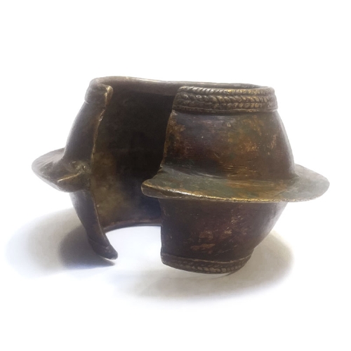 Bracelet en alliage cuivreux réalisé selon la technique de la fonte à la cire perdue. Acheté à GenèveEnchères, l'origine est imprécise, mais certainement du Burkina Faso, MOSSI, ou Côte d'Ivoire, BAOULÉ.  Peu ou pas porté, ce bracelet a une belle patine.