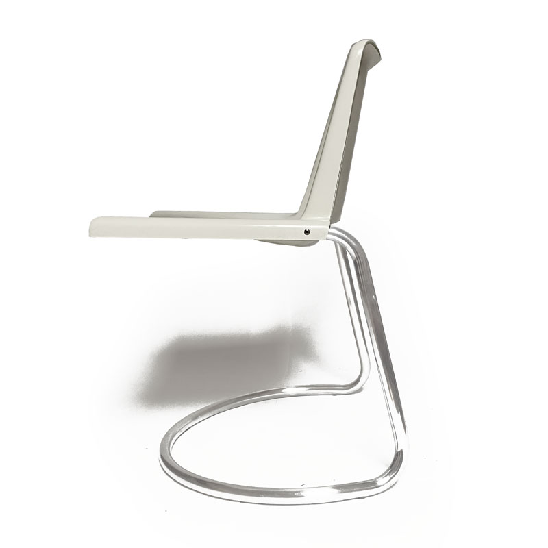 Chaise avant gardiste des années septante, avec sa coque en plastique sur métal tubulaire chromé. Le créateur, Giotto Stoppino est l'un des premiers designers à expérimenter les matières synthétiques dans le design industriel. Architecte et designer, il crée pour les belles entreprises du design italien