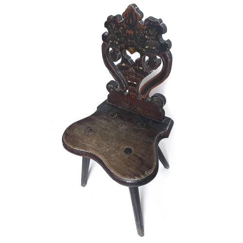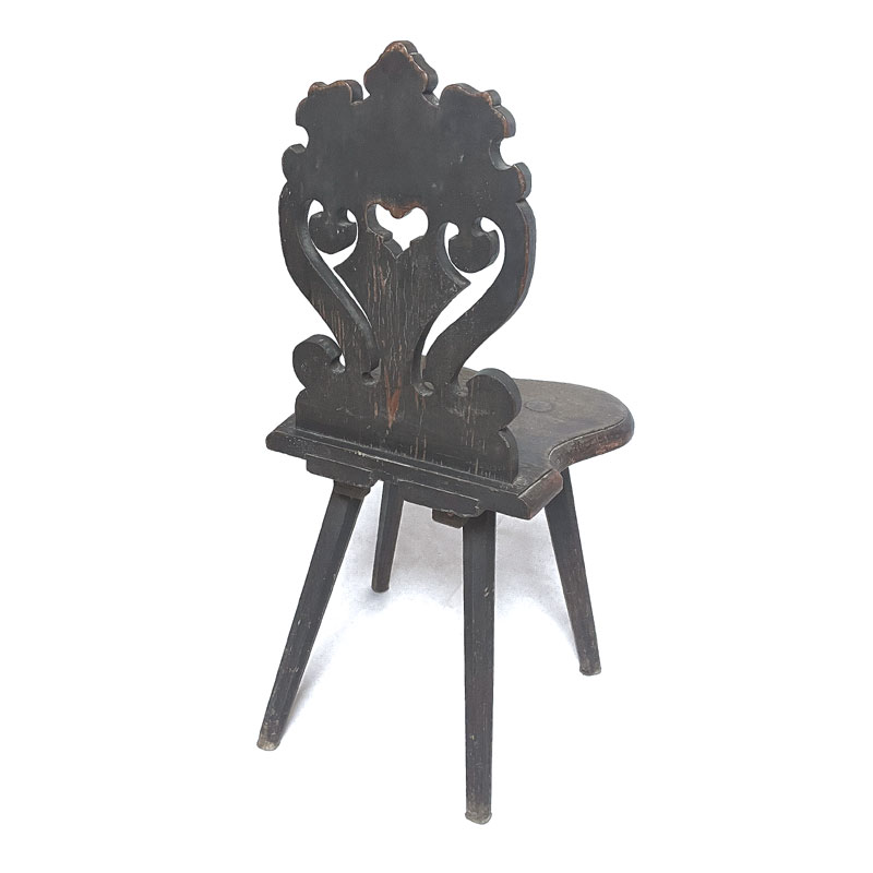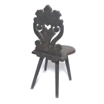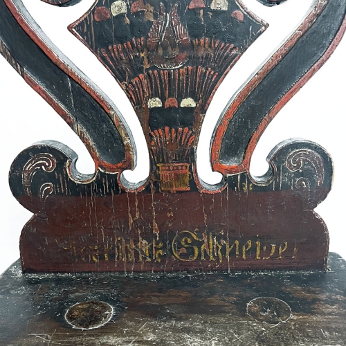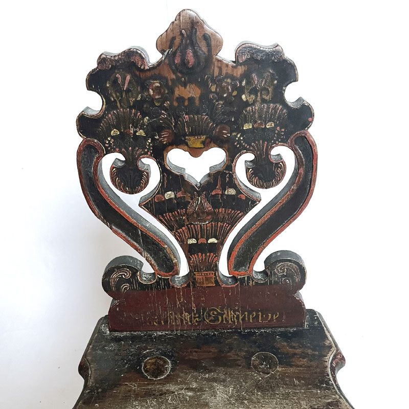 Chaise ancienne en bois provenant de Hongrie (Transylvanie). Les pieds sont légèrement coniques, octogonaux et obliques. Le dossier stylisé est peint de motifs végétaux stylisés. On voit aussi un motif de cœur ajouré au centre. La peinture colorée est entièrement d'origine sur cette chaise. Un nom a été ajouté en bas du dossier (mariage). Toutes les rayures, griffures, fissures et coups sont liés à l'âge et n'enlèvent rien à l'harmonie et à la fonction de cette chaise. Pièce unique.