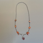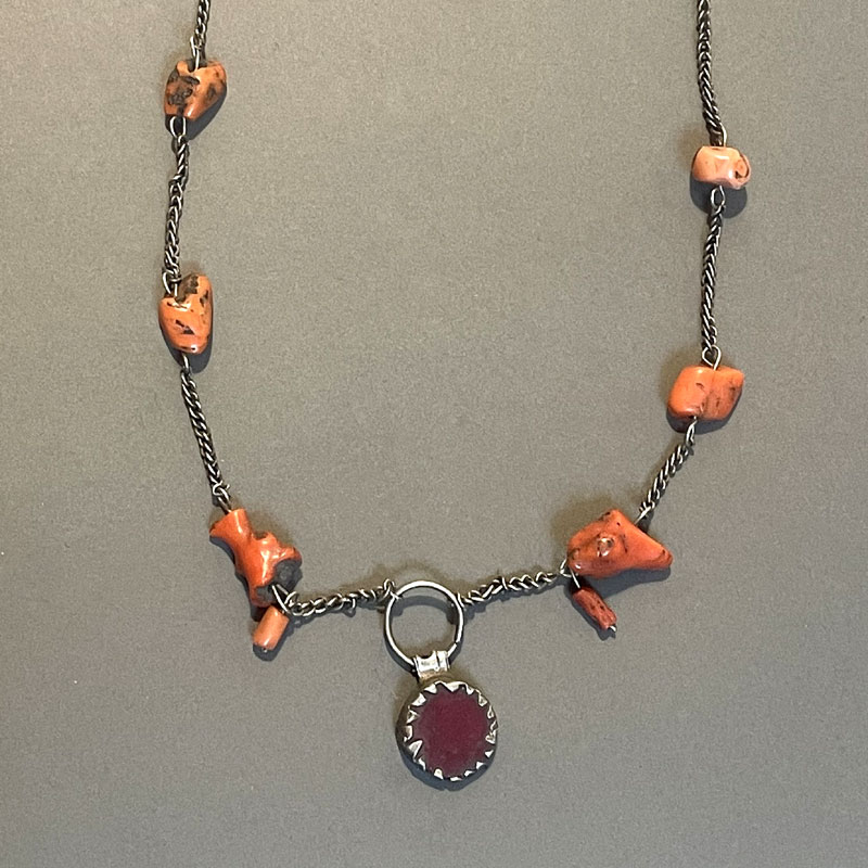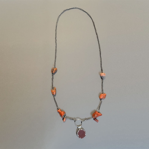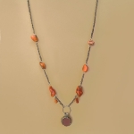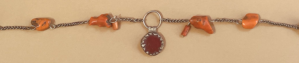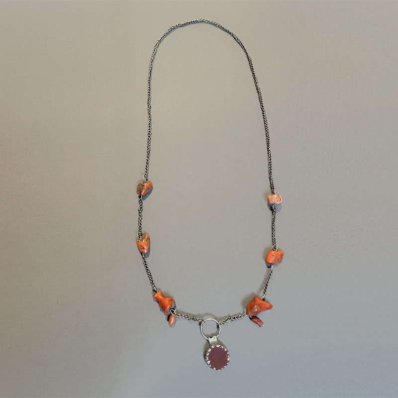 Joli collier ancien, avec un pendantif rond de couleur agate rouge. La chaine est agrémentée de 8 fragments de corail.  Sans fermoir, le collier est assez long pour passer la tête.