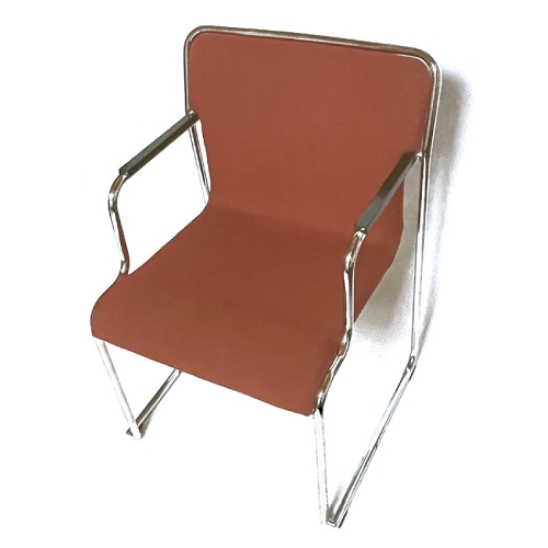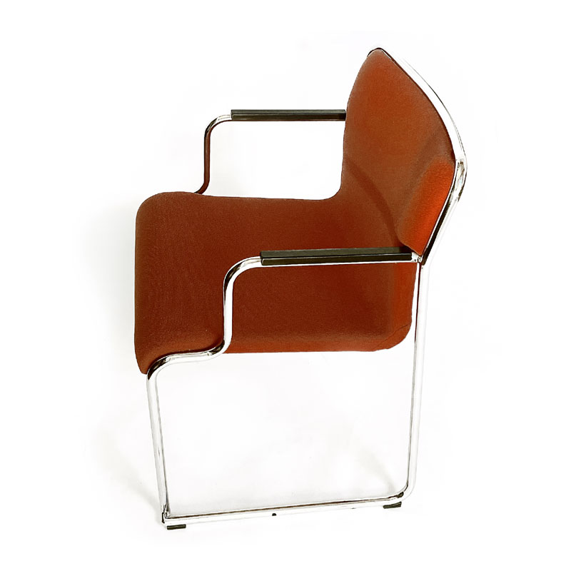 Design épuré, pour ce fauteil, produit dan les année 1980. Destiné plutôt aux collectivités, il est très compact. Le tube acier chromé entourant complètement le dossier, le rend trés robuste, indispensable pour un siège empilable. Il existe plusieurs versions de ce modèle.