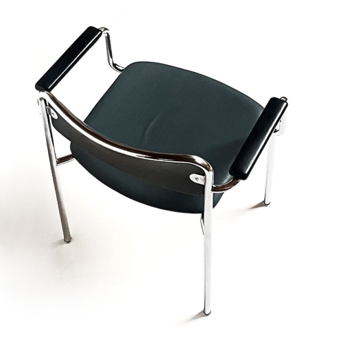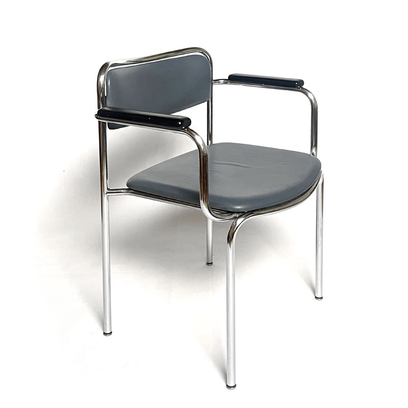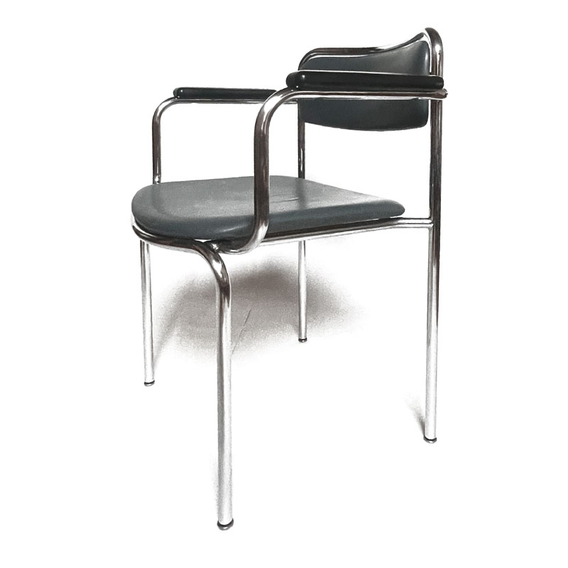 Fauteuil adapté à la production industrielle. La structure en tube d'acier chromé supporte une assise et un dossier rembourrés, recouverts d'un simili cuir gris-vert. Les accoudoirs sont aussi rembourrés, mais la couleur est noire.
