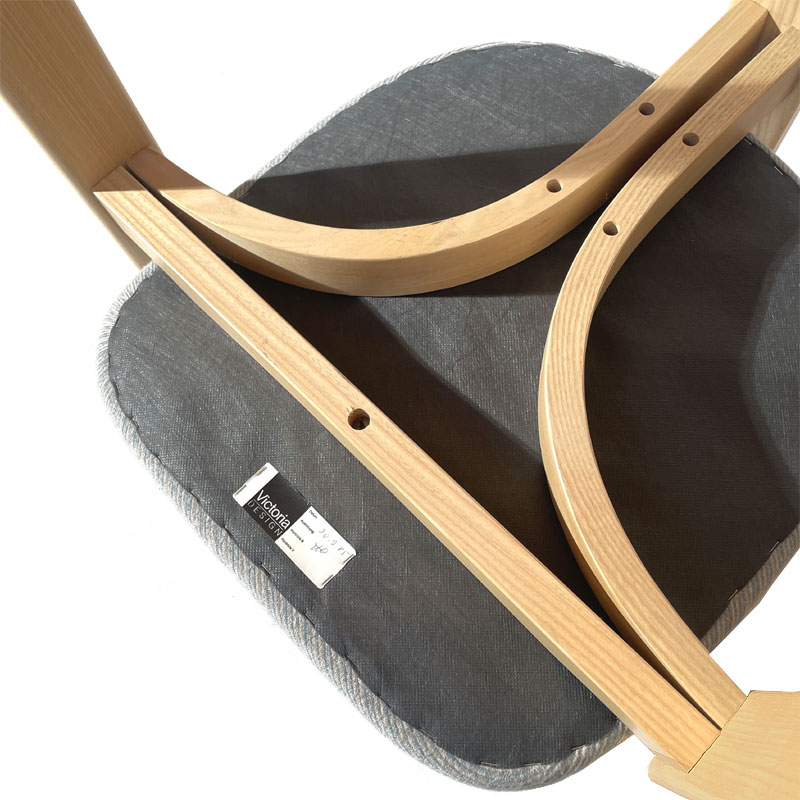 Le mobilier Victoria de la fabrique de Baar dans le canton de Zoug a habillé les intérieurs helvètes pendant près de 60 ans. La marque à la coccinelle, ayant souffert à la fin des années 90 de l’implantation massive en Suisse des géants du secteur, s’est humblement retirée du marché en 1998. La chaise présentée, d'esprit scandinave, fait partie d'un lot de 6 chaises.