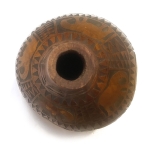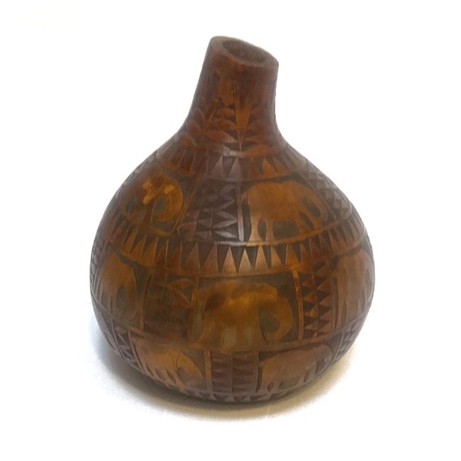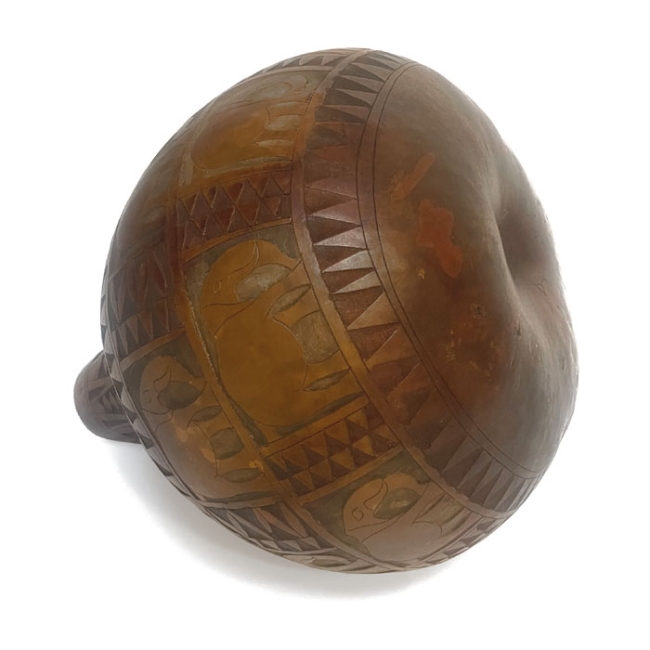 Calebasse pyrogravée ou gravée à la main, achetée sur un marché dans les années 1970. Bel objet décoratif, utilisé à l'origine en récipient pour le transport ou la conservation de l'eau ou du lait, est aussi couramment ouvré en ustensile de cuisine, louches, bols ou saladiers.