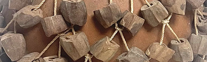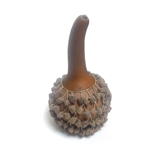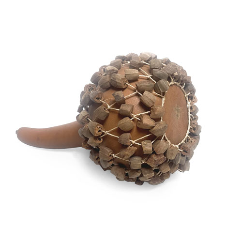 On l'appelle aussi shekeré. C'est une calebasse (courge) entouré d'un filet de graines, de perles ou de cauris (coquillages). Le shekeré est un instrument ancien, souvent associé aux cérémonies, danses et rituels. Il fait partie des instruments à percussion à secouer, comme les maracas ou les cabasas, mais avec une sonorité plus riche et texturée.