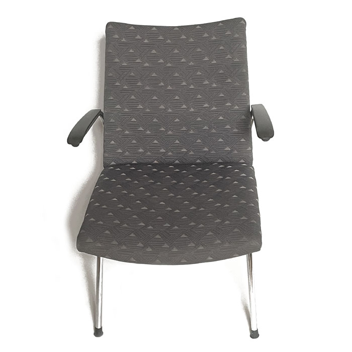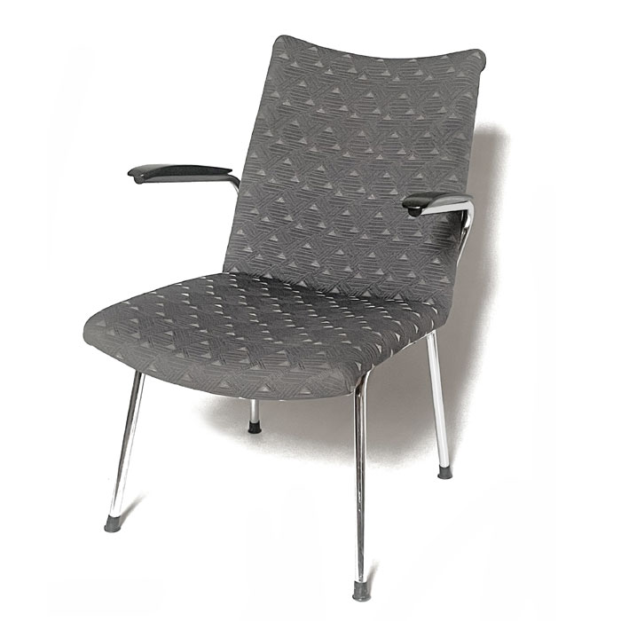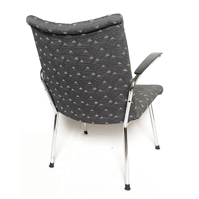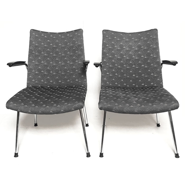 Les fauteuils ont une structure métallique simple, des accoudoirs en bakélite et un siège rembourré recouvert d'un tissu agréables à regarder, mais aussi durables et faciles d'entretien.