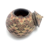 Panier traditionnel avec couvercle, tissé en Afrique du Sud. En feuilles de palmier, il est teinté naturellement à l’aide de boue, de feuilles, de cendres et de plantes. Par son motif, chaque panier est unique et chacun raconte une nouvelle histoire.