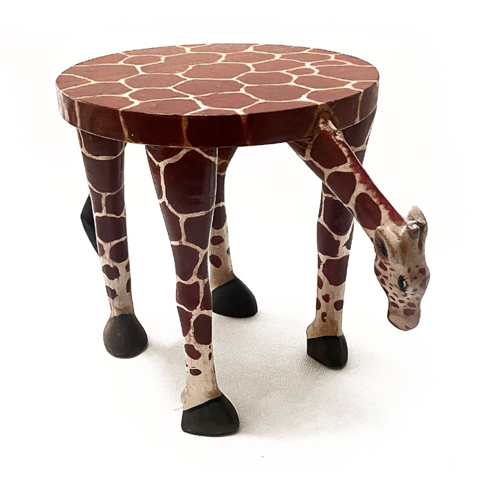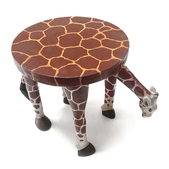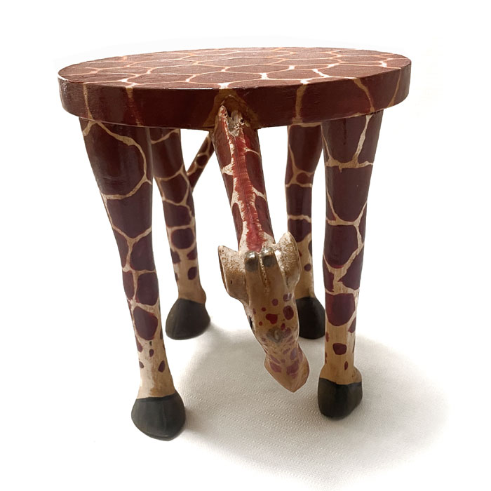 Petite sellete artisanale taillée dans un bois local du Kenya. Elle représente une girafe, animal emblématique de la brousse africaine. Importé de l'Afrique par le biais d'associations d'artisans et de commerces équitables, au début du 21e siècle.